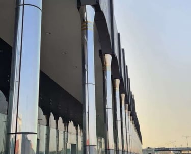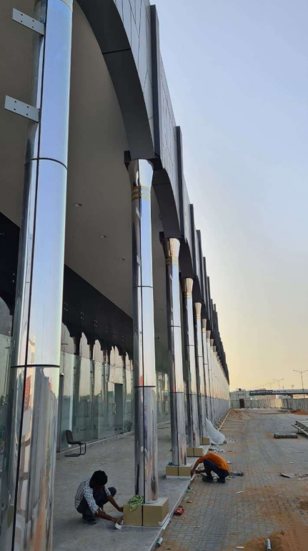 The structure features curved steel canopy beams supported by polished stainless-steel columns, creating a modern and elegant frontage. The mirror-finish columns were precision-fabricated and installed to ensure perfect alignment, durability, and corrosion resistance, particularly suited for outdoor environmental conditions.