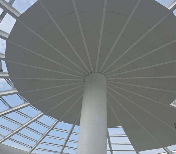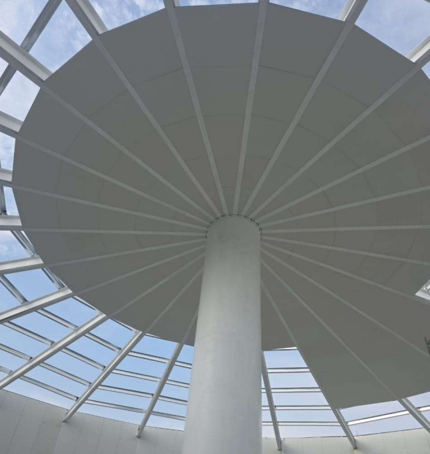 The canopy consists of a circular steel roof plate reinforced with radial beams extending from the central column, creating a visually striking sunburst pattern. Surrounding the structure is a glazed skylight framework that allows natural daylight to penetrate the space below while maintaining weather protection.